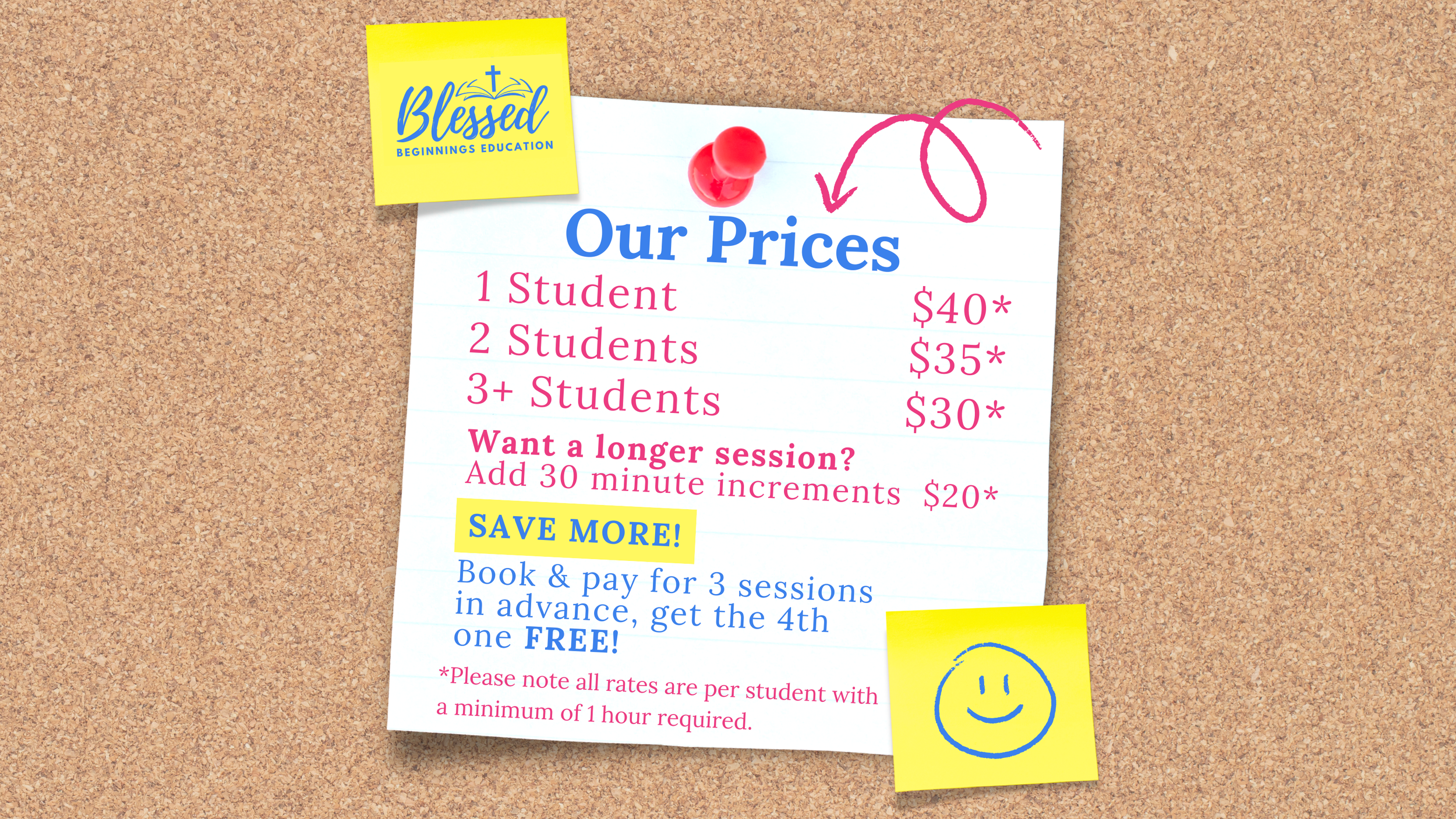 Each session type at Blessed Beginnings Education is a minimum of one hour. We believe that at least one hour is necessary to ensure effective learning and review, maintain student engagement, and provide a well rounded approach both Biblically and academically.